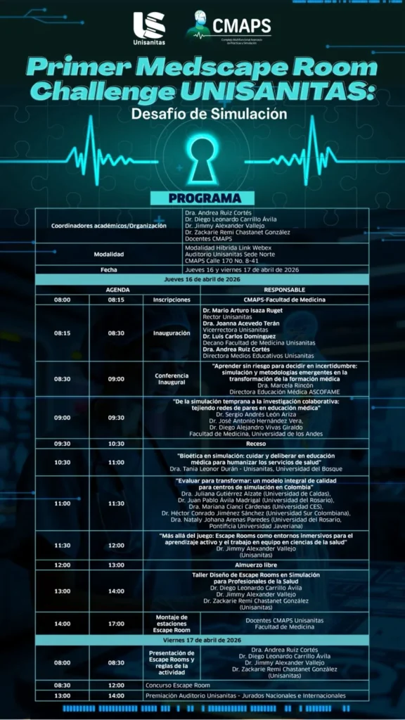 El Medscape Room Challenge UNISANITAS se desarrollará en el Auditorio UNISANITAS Sede Norte (CMAPS, Calle 170 No. 8-41, Colombia), bajo una modalidad híbrida que permitirá la participación tanto presencial como virtual a través de transmisión en Webex. Esta combinación amplía el alcance de la experiencia, facilitando la conexión entre distintas instituciones y promoviendo la participación de diversas universidades de Colombia en torno al diseño y aplicación del escape room